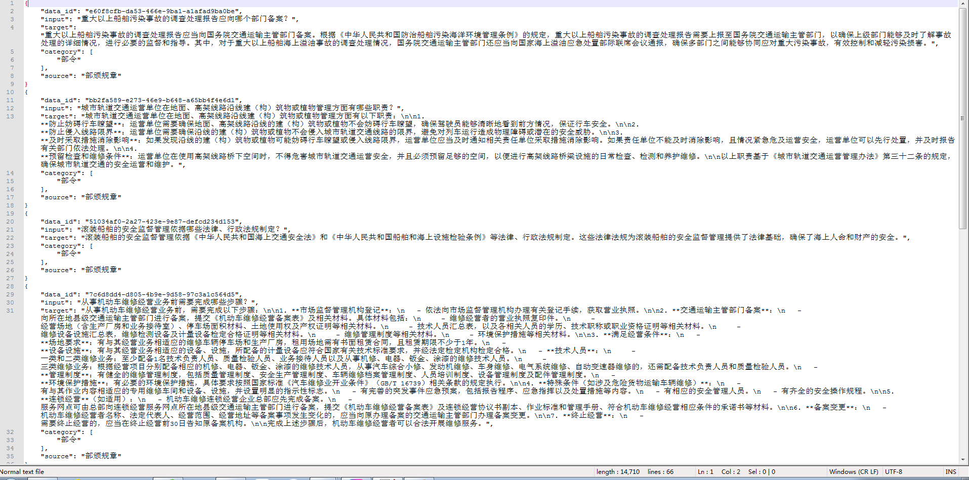 将答案数据与对应的问题数据组合,保留高质量的问答对数据。通过上述流程建成约15万对文本问答对的交通政策法规与标准规范数据集,数据集规模如表2,数据集以JSON/JSONL格式存储,包含编号、输入、输出、分类、来源等字段。