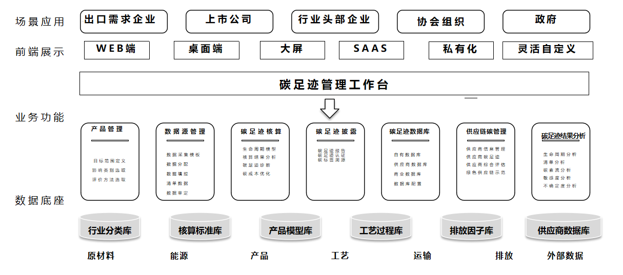 本平台具备全面的碳足迹核算、建模、分析和报告功能,严格遵循国际标准ISO 14067、国家标准GB/T 24067及欧盟PEF等相关标准和方法要求,业务和技术架构如下。