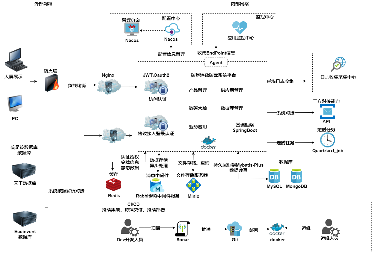 业务中台化:以SpringBoot为核心框架,将碳核算、供应商管理、产品管理等业务模块抽象为独立微服务(业务应用),支持快速迭代与横向扩展。