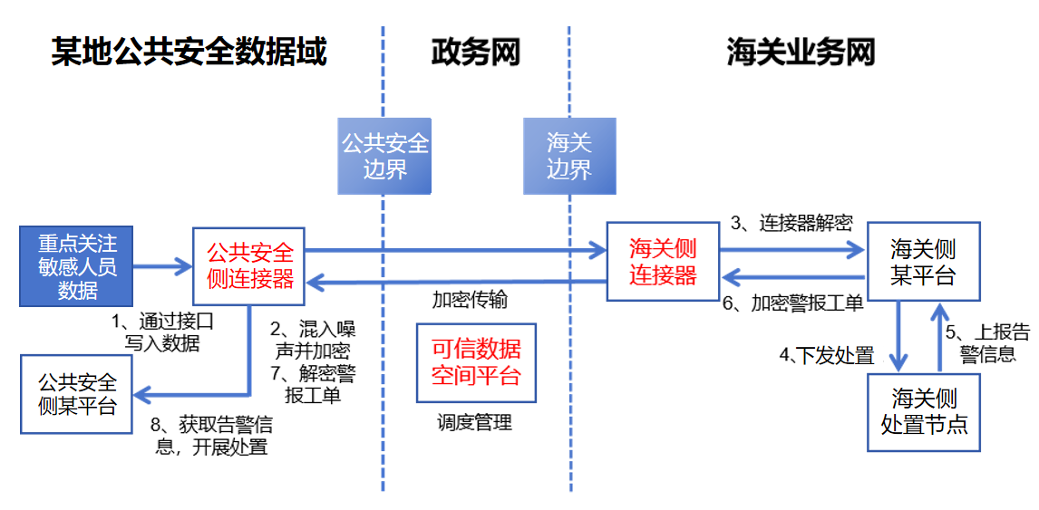 5、双方单位连接器将结果提供至相应平台,公共安全部门与海关根据最终结果同步开展相应处置工作。