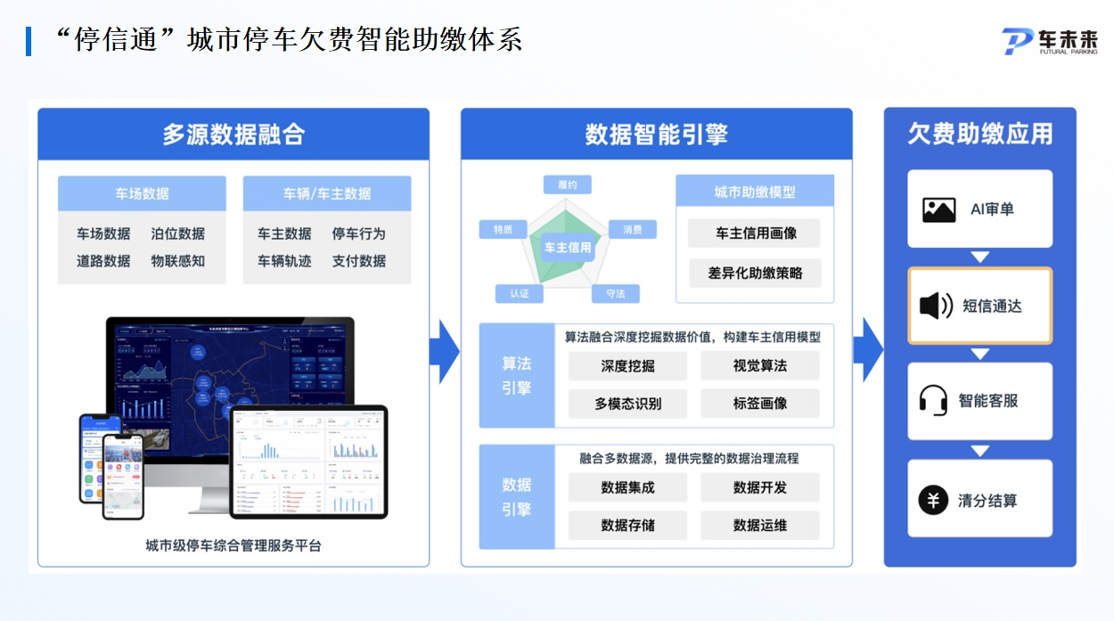 为解决天津市路侧停车长期存在的欠费难题,破解传统助缴方式流程繁琐、效率低下、舆情风险高的痛点,车未来依托自身技术与方案优势,打造“停信通”城市停车欠费智能助缴体系。