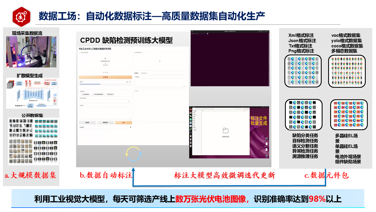 打造两大创新模式,筑牢项目核心竞争力。一方面,构建光伏行业首个全流程数据标注工作流,覆盖数据采集、清洗、预处理、增强扩充、标注、质量控制、迭代优化全环节,形成完整闭环,规范行业大规模数据标注流程。另一方面,建立数据标注大模型与高质量数据集双向反馈循环机制,用标注数据训练优化模型,依托模型输出反向提升标注数据质量,通过迭代训练策略持续升级技术体系。
