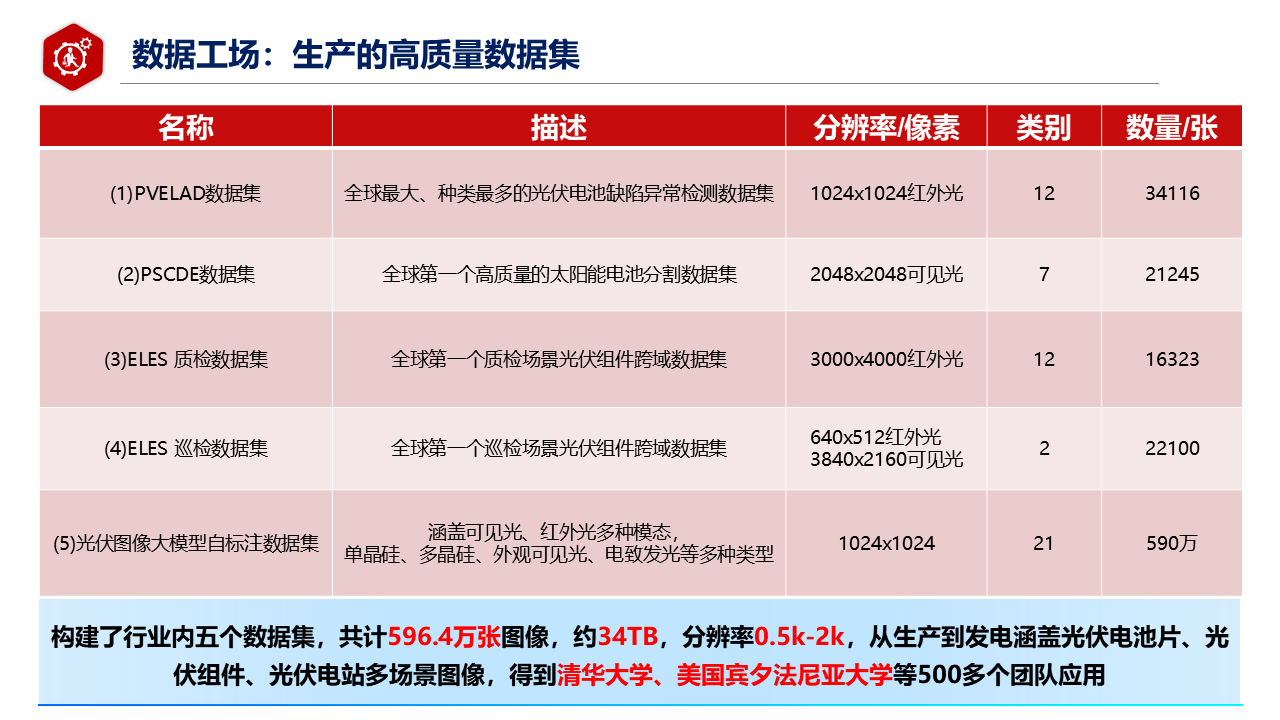 基于自研标注技术与工作流,建成光伏行业五大专项数据集,累计包含600多万张图像,数据总量约34TB,图像分辨率覆盖0.5k-2k,全面涵盖光伏电池片、光伏组件生产环节及光伏电站运维环节,实现从生产制造到发电运维全场景覆盖,为大模型训练、智能装备研发提供海量优质数据支撑。