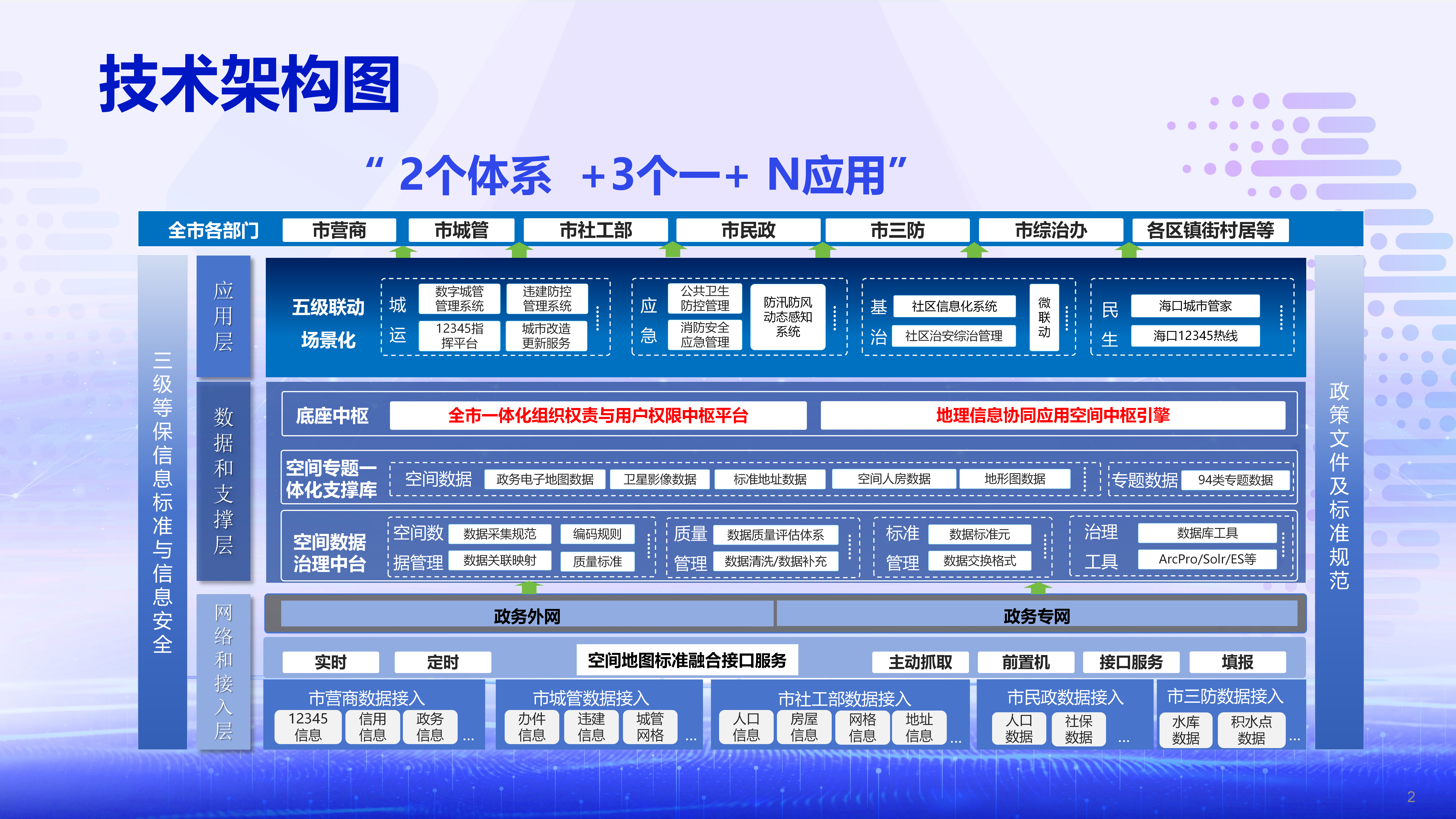 管理制度体系:制定全市统一的数据分级分类标准与共享交换规则,规范数据全流程管理,推行ISO9001质量管理体系,明确数据采集、汇聚、更新、应用等环节操作规范,建立长效机制,从制度层面破解数据壁垒、协同不畅、更新滞后等问题。