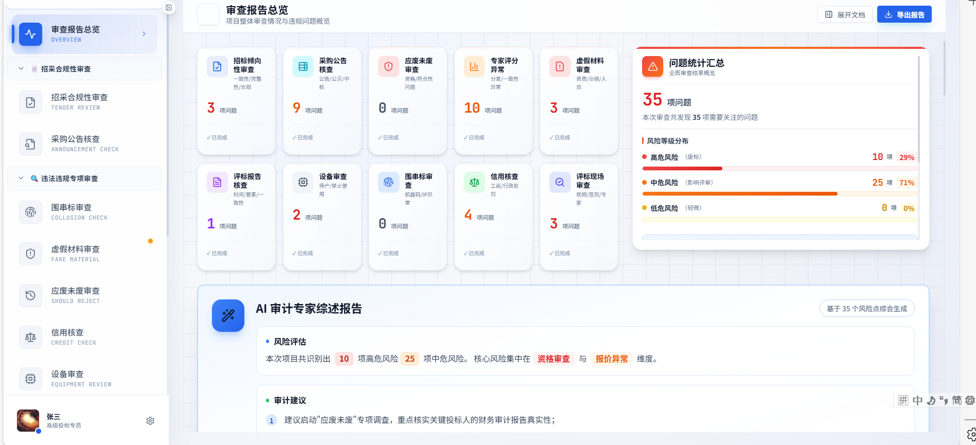 招采合规性审查模块:从招标文件、采购公告两大维度开展合规核查,对招标文件进行合规性、完整性、一致性三维度检查,识别倾向性、歧视性条款,核查采购公告发布时间、内容一致性等合规要求,明确问题法规依据并给出修正建议,从源头规范招采行为。