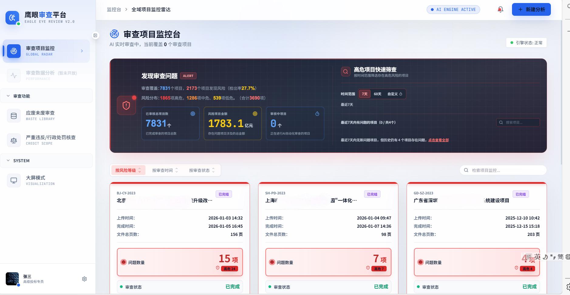可视化智能管控模块:搭建审查项目监控台与大数据监控大屏,实时展示审查总量、风险项目占比、违规问题分布等核心指标,支持按风险等级、项目类型等维度快速筛选高危项目,通过地图热力图、条形图、折线图等可视化形式呈现全域风险态势,实现风险即时预警与监管资源精准调配。