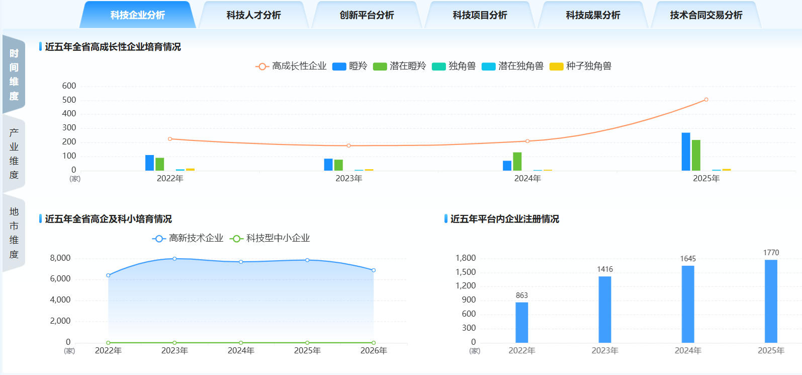 主题分析。以科技资源基础数据库中基础数据为基础,通过数据关联、数据标识、数据融合等处理手段,将基础数据映射到科技项目资源、创新平台资源、科技企业资源、科技人才资源、科技成果等专题应用场景中,梳理出不同场景不同主题的科技专题资源,同时从时间纬度、空间维度、产业维度分析动态变化趋势,为科技管理工作人员提供数据支撑。