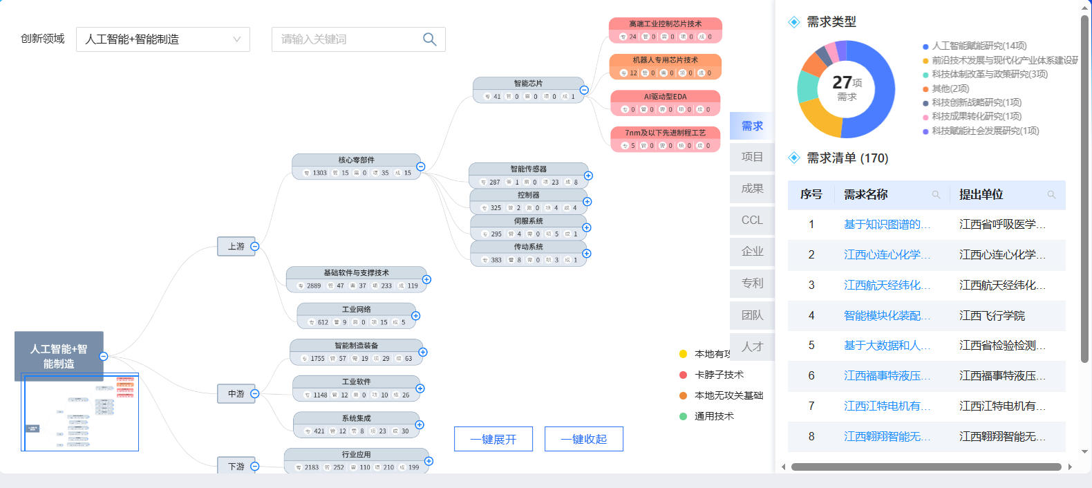 创新链图谱。该功能模块核心在于实现创新数据一链总览,即可查看该创新链及其下属节点的技术路线图、技术问题清单、布局项目情况、科技人才情况、创新平台情况、专利情况等创新数据。通过创新链图谱创新数据的分析以及展示,辅助领导进行决策,为科技项目布局提供有力数据支撑。下图是智能制造领域的创新链图谱以及对应技术清单、需求清单、项目清单、成果清单、团队清单等示例。