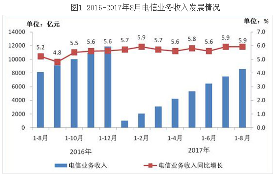 1-8月,电信业务总量完成15589亿元,同比增长59.2%。电信业务收入完成8594亿元,同比增长5.9%。