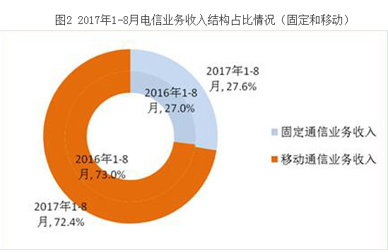 中西部收入增速小幅提高。1-8月,东、中、西部地区电信业务收入同比分别增长6.2%、6.2%和7.3%,中部和西部地区增速比上年同期均提升0.3个百分点,东部地区增速回落0.1个百分点。东、中、西部电信收入占比分别为53.4%、22.9%和23.7%。