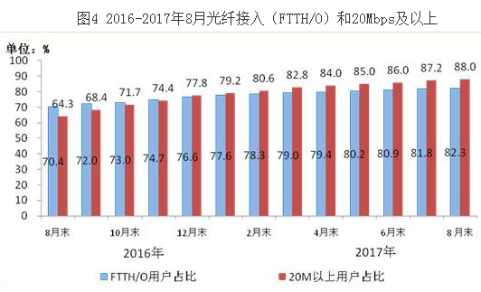 50Mbps及以上固定宽带接入用户占比近六成,光纤接入用户累计净增4409万户。8月末,三家基础电信企业的固定互联网宽带接入用户总数达3.3亿户,其中1-8月净增3282万户。20Mbps及以上接入速率的固定互联网宽带接入用户总数达2.9亿户,占比为88%;50Mbps及以上接入速率的固定互联网宽带接入用户总数达1.97亿户,占总用户数的59.8%,其中1-8月净增7070万户。光纤接入(FTTH/O)用户总数达到2.72亿户,比上年末净增4409万户,占固定互联网宽带接入用户总数的82.3%,较上月提高0.5个百分点。