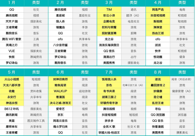 从8月的榜单来看,游戏有4席,占据近半壁江山。而从1到8月数据看,跟游戏有关的APP一共28款,占总数的35%,这说明,中国互联网确实已进入“在线娱乐的黄金时代”。