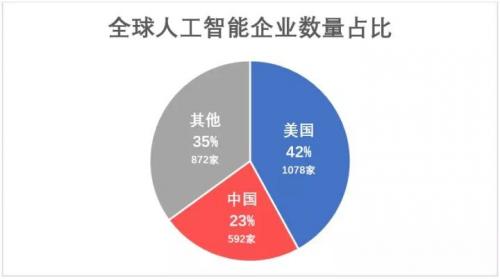 截止到2017年6月,全球人工智能企业总数为2542家,其中美国1078家,占42%;中国592家占23%;其余872家企业分布在其他国家。