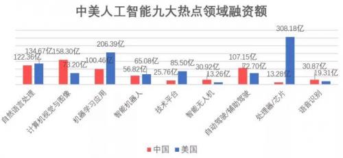 从目前人工智能九大热门领域来看,美国的投资也强于中国。同时可以看到,在处理器/芯片这种基础层领域,美国远胜于中国,企业数量美国是中国的2.3倍,而融资额美国则达到了中国的23倍。而中国则明显更偏重于应用层,只有计算机视觉、自然语言处理、智能机器人和语音识别能与美国抗衡。可以说相较于中国“头重脚轻”的现状,美国的产业布局更加合理。