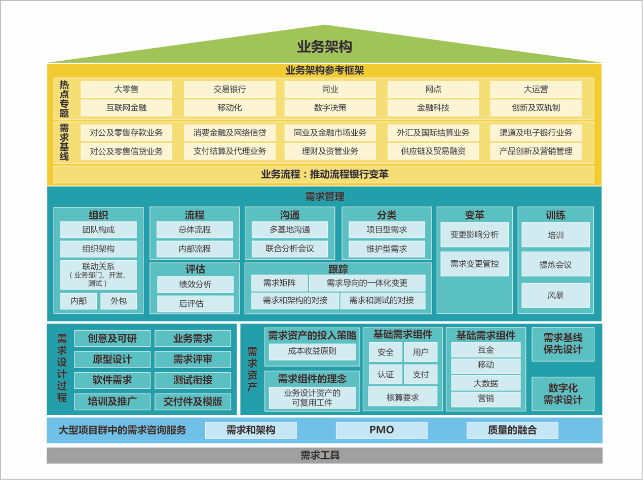 可以预见,挑战与机遇并存,“四新”趋势下高度动态、持续快速的响应市场需求是银行在当下取得成功的关键。信息科技作为实现银行战略的重要手段,科技组织也在不断演进自身的价值定位,从技术提供者逐步向战略推动者转型。在全行的转型战略中,科技部门如何发挥科技领跑作用、更好的承接战略的落地、更加快速有序的组织IT建设战役,是科技部门面临的重大课题。而需求管理与设计是IT建设的前置环节,准确的捕获、分析、规划、设计需求,提升需求服务和管理水平是后续工作效能提升的先决条件和重要保障。