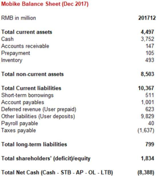 摩拜内部的财务报表显示,截至当前摩拜挪用用户押金60亿元人民币,供应商欠款约10亿人民币,债务总额合计超过10亿美元。除去债务(用户押金及供应商欠款),摩拜的实际出售价格为27亿美元,低于其上一轮融资34.5亿美元的估值。