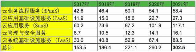 而2021年,全球公有云服务市场规模将达到3020亿美元,届时排名世界前十的公司将占据约70%的市场份额,相比2016年的50%有所提高。Gartner将云计算市场分为五个不同的细分市场,并表示他们将在未来四年内不断扩大。