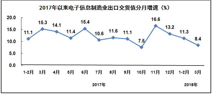 2018年一季度,在供给侧结构性改革和创新驱动发展战略引领下,电子信息制造业加快结构调整,推动转型升级,产业景气度继续提振,生产和投资增速在工业各行业中保持领先水平,产业总体保持稳健增长,为全年产业持续健康发展打下坚实基础。