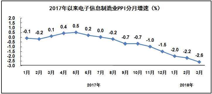 一季度,电子信息制造业生产者出厂价格同比下降2.3%。3月份,电子信息制造业生产者出厂价格(PPI)同比下降2.6%,环比下降0.4%,延续去年三季度以来的下降趋势。