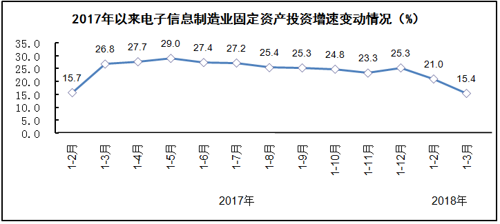 一季度,电子信息制造业固定资产投资同比增长15.4%,增速同比回落11.4个百分点,高于制造业投资增速11.6个百分点。其中,通信设备制造行业景气度较高,投资增势突出,同比增长38.2%。