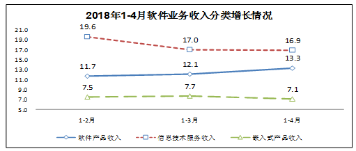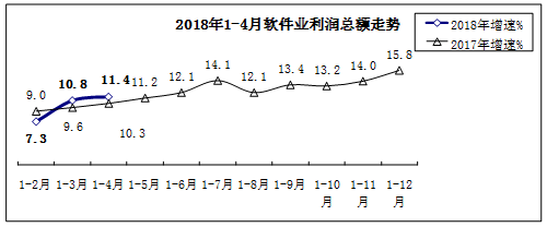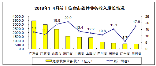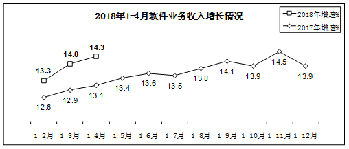 软件业务收入增速继续回升。1-4月,我国软件和信息技术服务业完成软件业务收入18189亿元,同比增长14.3%,增速同比提高1.2个百分点。其中3、4月份均增长15.1%,快于1-2月平均增速1.8个百分点。
