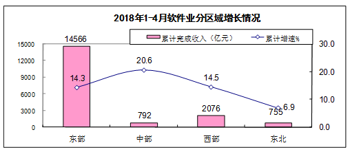 中部地区软件业收入增势较突出,西部地区保持较快增长。1-4月,中部地区完成软件业务收入792亿元,增长20.6%,增速同比提高5.1个百分点,高出全国平均水平6.3个百分点;其中安徽、湖北、江西、河南软件业务收入增速均超过20%。西部地区完成软件业务收入2076亿元,增长14.5%,增速同比回落3.8个百分点。