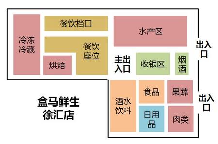 先看盒马。在门店布局的方面,盒马鲜生的生鲜面积占比是非常大的,而且是以中高端的品类为主,同时增加餐饮区域,支持现购现做。