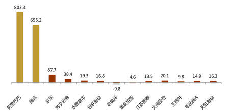 互联网巨头和 A 股收入前十零售企业经营性净现金流(亿元,去年年报)