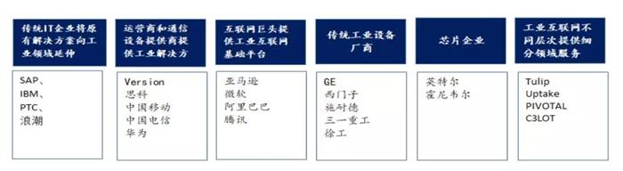 从参与者的传统业务属性看, 工业互联网企业的参与者划分为六大类,(1)传统 IT企业将原有的解决方案向工业领域延伸;(2)运营商和通信设备提供商借助渠道优势提供工业解决方案;(3)互联网巨头提供工业互联网基础平台支撑;(4)传统工业设备厂商发挥在设备和细分行业经验方面的优势,为客户提供整体解决方案;(5)芯片企业研发低功耗互联网芯片;(6)创业公司在工业互联网不同层次或不同环节等细分领域提供专业服务。