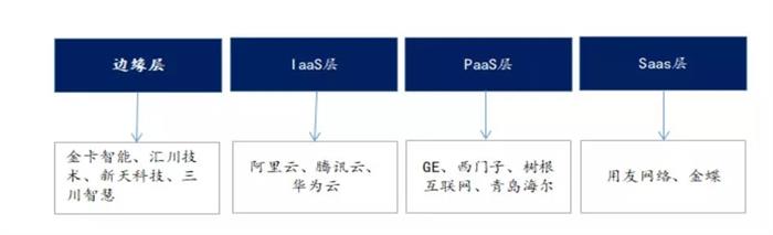 从工业互联网结构层看,工业互联网平台企业划分为四层:(1)边缘层,主要解决的是数据采集;(2) Iaas 层(云基础设施),成熟度最高,主要解决的是数据的存储与分析,成熟度最高;(3)Paas 层(工业操作系统),主要解决是协议和标准问题,是架构中的重中之重;(4)工业 SaaS 层(工业 APP), 国内布局较少。