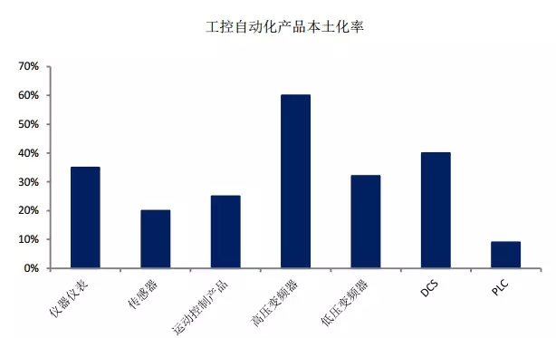 边缘层接入的智能硬件设备需求将最直接地带动工控自动化产品的增长。 工控市场产品主要包括仪器仪表、传感器、运动控制产品、高压变频器、低压变频器、 DCS 和 PLC等核心产品。目前我国核心的工控产品国产化率不到 35%, 以 PLC 为例,本土化率不足10%。