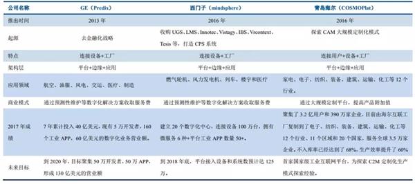 截至 2017 年末,全球工业互联网平台数目已超过 150 个, 其中有近 50%的工业互联网平台分布在美国。 GE 的 Predix 是世界上第一个工业互联网平台。国内与之对应的工业互联网平台有海尔的 COSMOPlat、 三一重工的树根互联网等。