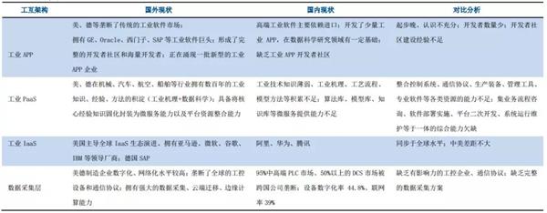 国内工业互联网的差距主要体现在数据采集层、工业 PaaS 层和工业 APP 层。