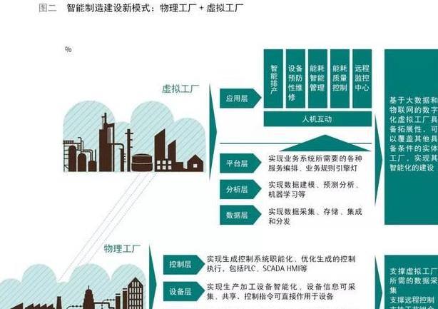 智能制造以智能工厂为载体,智能工厂就是“物理工厂+ 虚拟工厂”(见图二),依靠自动化生产设备构建而成的物理工厂是智能制造的基础,也是绝大多数中国制造工厂现阶段转型提升的重点,即实现生产自动化。在生产自动化的基础上,通过应用物联网和大数据,以端到端数据流为基础,以互联互通为支撑,构建高度灵活的个性化和数字化智能制造模式,实现信息深度自感知、智慧优化自决策、精准控制自执行,这是虚拟工厂建设的重点,也是制造行业在生产自动化程度已经达到较高水平后,将装备优势转化为产品和市场优势、实现升级转型和赶超世界先进水平的重点路径。