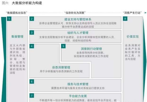 第二个阶段是将信息转化为洞察:这一阶段建设重点是通过相应的运行机制、数据分析平台和数据分析手段,利用数据分析挖掘根因,为管理决策提供支持。本阶段需要从6个方面着手进行建设,包括