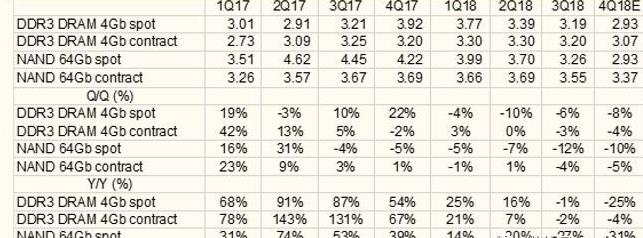 我们的预估比DRAMeXchange对明年存储器芯片产业5%的同比成长预估来的悲观许多,但DRAMeXchange上周五也下修今年第四季度的DRAM合约价格预期,从1-3%价格环比下跌下修到5%的价格下跌。虽然存储器价格下行趋势确立,但我们预估此次下行趋势应不超过18个月,英特尔14纳米x86 CPU短缺状况应会于明年中之前改善,10纳米x86 CPU应于明年下半年量产,AMD 7纳米x86 CPU,7纳米挖矿机及智能手机,5G手机都将于明年出笼而对存储器半导体产生正面影响。