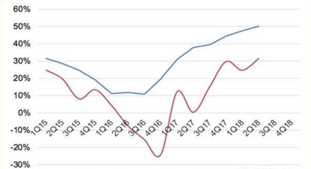 因为英特尔14纳米x86 CPU短缺可能持续到明年第一季度,而造成某些特定客户开始清除因之前担心涨价而多建的库存,加上美国提高关税的不利影响,美光预期第四季度销售环比衰退2-6%而低于市场预期。而我们认为比特币价格下跌造成的中低阶挖矿机需求不振,及新兴市场货币贬值造成的中低阶手机销售不佳,加上3D NAND转到96层及DRAM转到19纳米以下制程工艺的产能增加,我们预估明年内存DRAM和闪存NAND将会有3-5%的供过于求,价格下行趋势确立,而将造成2019年整体存储器芯片产业同比衰退5-9%及全球半导体产业同比衰退14%。