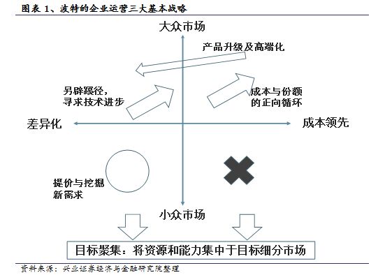 被誉为“竞争战略之父”的美国学者迈克尔.波特为商界人士提供了三种基本竞争战略:成本领先战略、差异化战略和目标集聚战略。