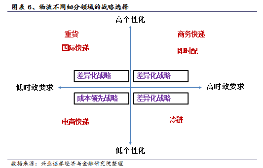 电商快递的标准化服务特性决定了其成本领先的战略。而当前顺丰打造综合物流服务平台,多元化的发展(规模效益弱)决定了其必须选择差异化战略。