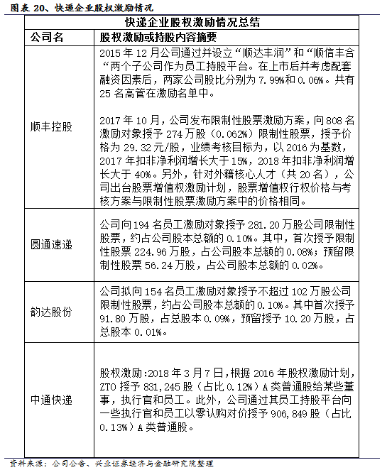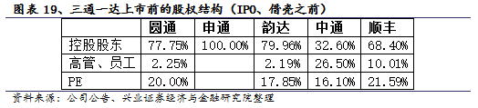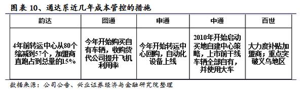 2)组织架构的优化。加盟体制组织架构的优化。最重要的改革是削藩减少层级,圆通和韵达通过强力收购,中通通过换股收购使得大加盟商成为中通的股东。完成了总部对转运中心的控制。申通今年开始加快收购收转运中心,有利于总部对干线网络继续投资