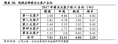 加盟制快递总部的主要客户是快递加盟商,前五大客户收入占比反映大加盟商在网络中的影响力。一般而言,加盟商集中度越低,总部对网络的控制力越强,总部实现网络平衡的调控越明显。早年多数快递公司的“削藩行动”主要是为了降低大加盟商在网络中影响力。