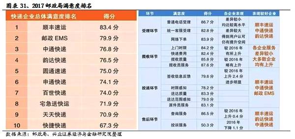 2017年,邮政局公布的总体满意度排名,中通位列第三,前两名顺丰、EMS均是直营商务快递。在多项单个环节,中通都进入前三。