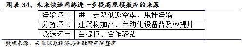 我们认为电商快递行业规模效应仍有提升空间,通过线路优化、车辆组织模式改进、分拣中心挖潜等手段带来单件成本进一步下降,我们估算分拣+运输成本极限为0.6元/件。