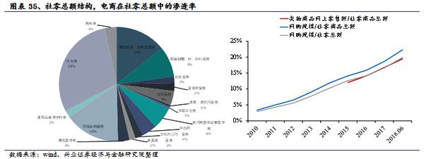 将社会消费品零售总额按品类进行分拆,我们认为除去汽车、石油等短期难以电商化,或即使电商化也无法被快递运输的消费品,剩下的产品占比则为电商渗透率的理论上限,即50%以上。