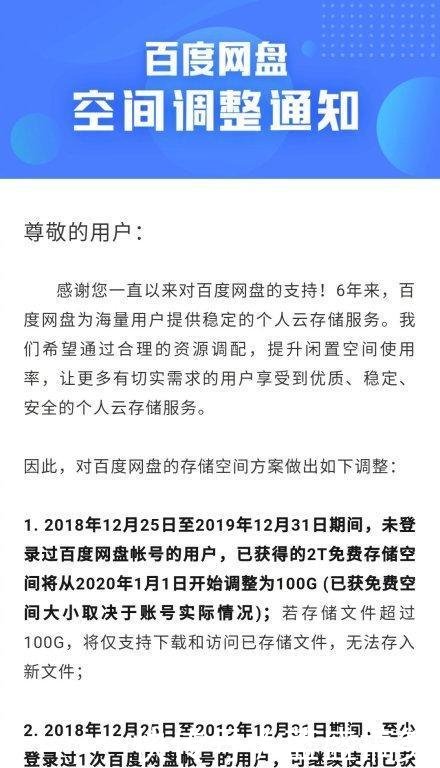 1.2018年12月25日至2019年12月31日期间,未登录过百度网盘帐号的用户,已获得的2T免费存储空间将从2020年1月1日开始调整为100G(已获免费空间大小取决于帐号实际情况);若存储文件超过100G,将仅支持下载和访问已存储文件,无法存入新文件;