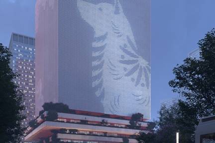 这个建筑物的外立面覆盖着混凝土面板,白天呈现出一个旋转的云彩图像;在夜晚,每个面板都会亮起,以创造灵感来自中国传统艺术的图像。