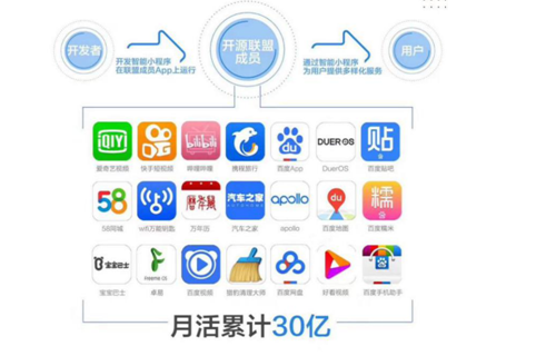 从百度透露的“40+入口”、“1.5+亿日活”两个数据可以看出百度的巨大流量,百度贴吧、百度地图、好看视频等都将全面拥抱智能小程序。同时百度也一直拓展更多外部流量。据不完全统计,开源联盟中百度系App及其联盟伙伴的App月活用户在不去重的情况下达到30亿规模。