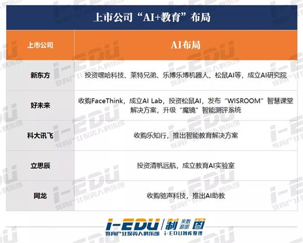 教育类上市公司主要通过并购及深耕自身技术等方面布局AI,好未来曾在2017年投资人工智能技术公司FaceThink情感计算和松鼠AI,并在近日发布“WISROOM”智慧课堂解决方案,升级“魔镜”智能测评系统;新东方近几年投资多家AI公司,并成立AI研究院。由此看出,上市企业切入AI主要考虑与现有业务产生协同或对现有教育版图有所扩充。