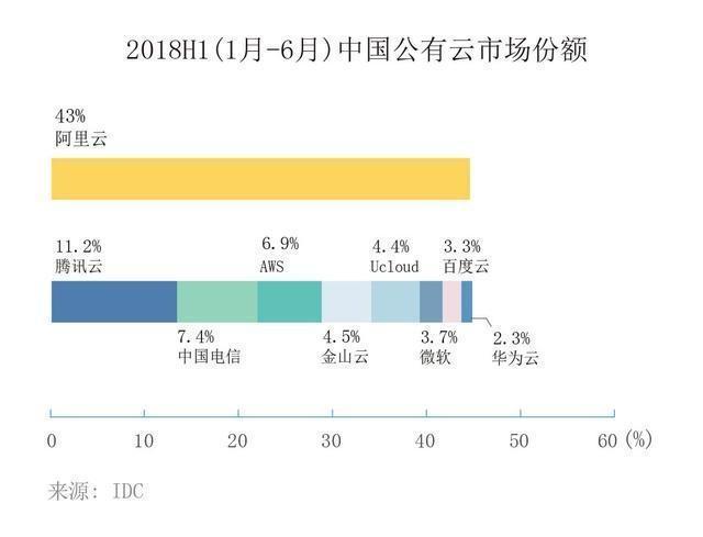 日前,2018年上半年中国各大云计算平台的市场份额排名被正式公布——榜单显示,阿里云凭借43%的市场份额荣登榜首,腾讯云则以11.2%的市场份额紧随其后,中国电信占据市场份额数为个位数,位列第三。