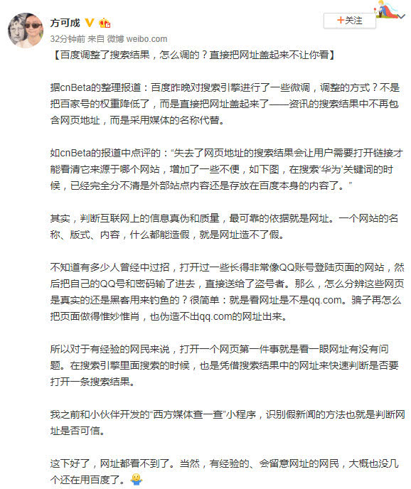 1月25日,有消息称百度对搜索引擎进行微调,资讯的搜索结果中不再包含网页地址,而是采用媒体的名称代替。对此,《搜索引擎百度已死》方可成表示,“判断互联网上的信息真伪和质量,最可靠的依据就是网址。一个网站的名称、版式、内容,什么都能造假,就是网址造不了假。”